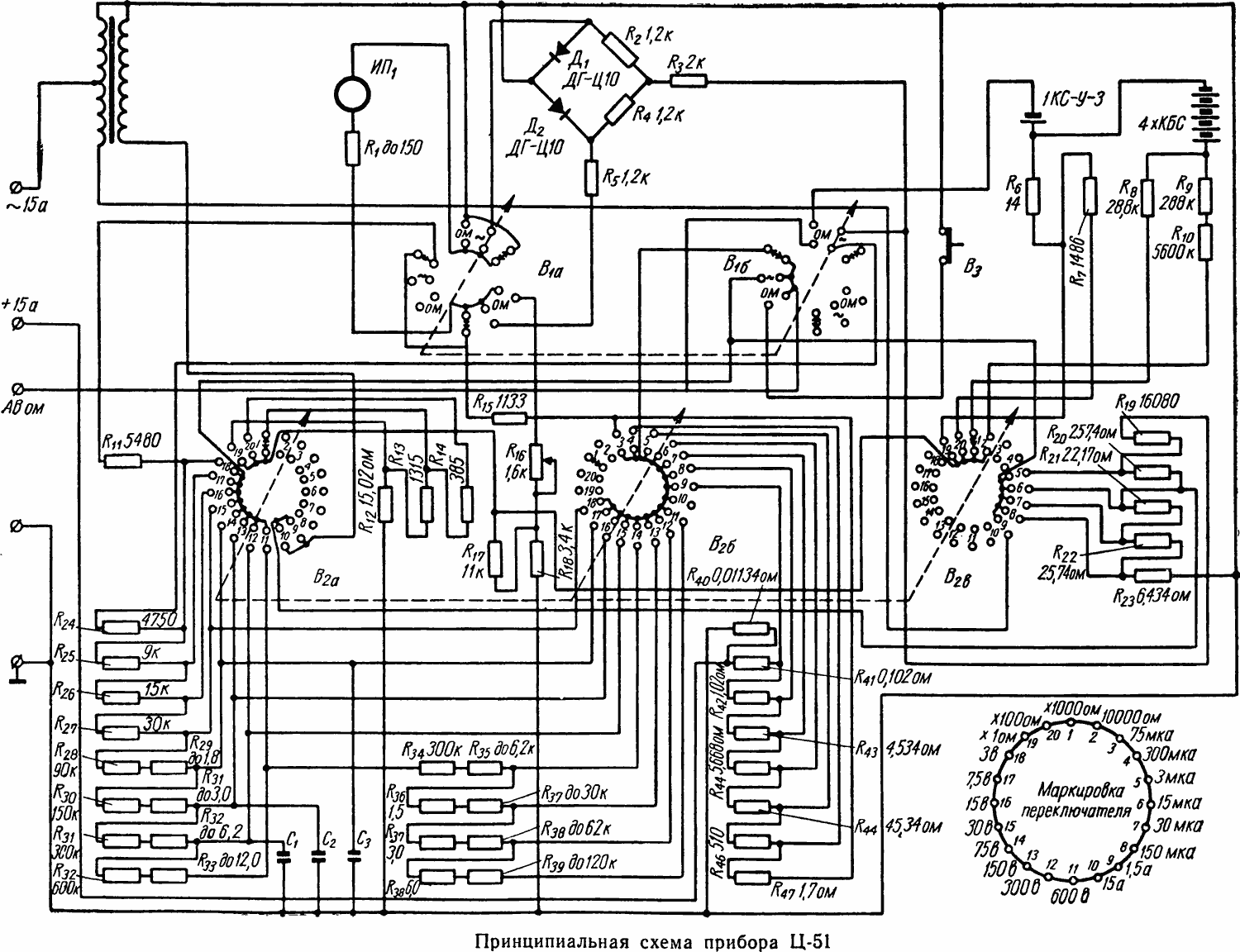 Схема принципиальная электрическая ампервольтметра Ц-51