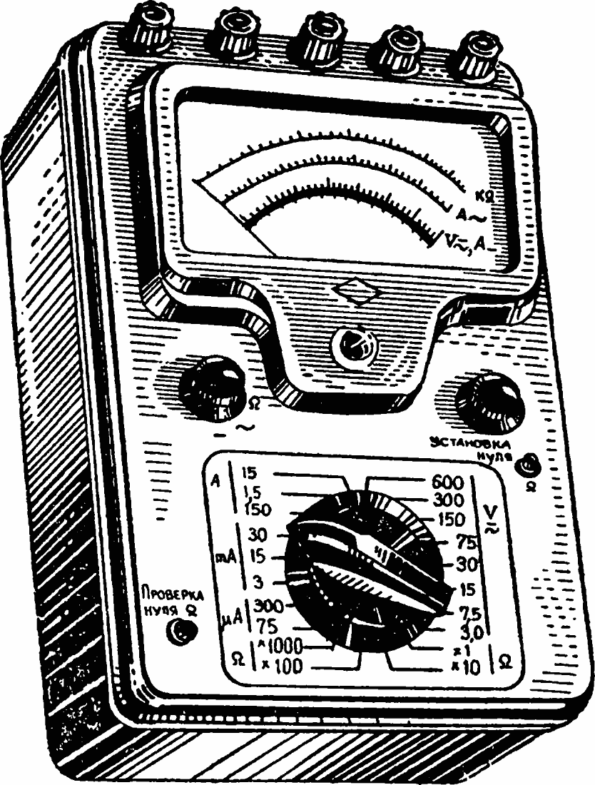 В качестве выпрямителя используется мостик из двух германиевых диодов ДГЦ-10 и двух сопротивлений R4 и R5 по 1,2 ком. Для измерения тока прибор включается в цепь через клеммы «—» и «AVΩ».
