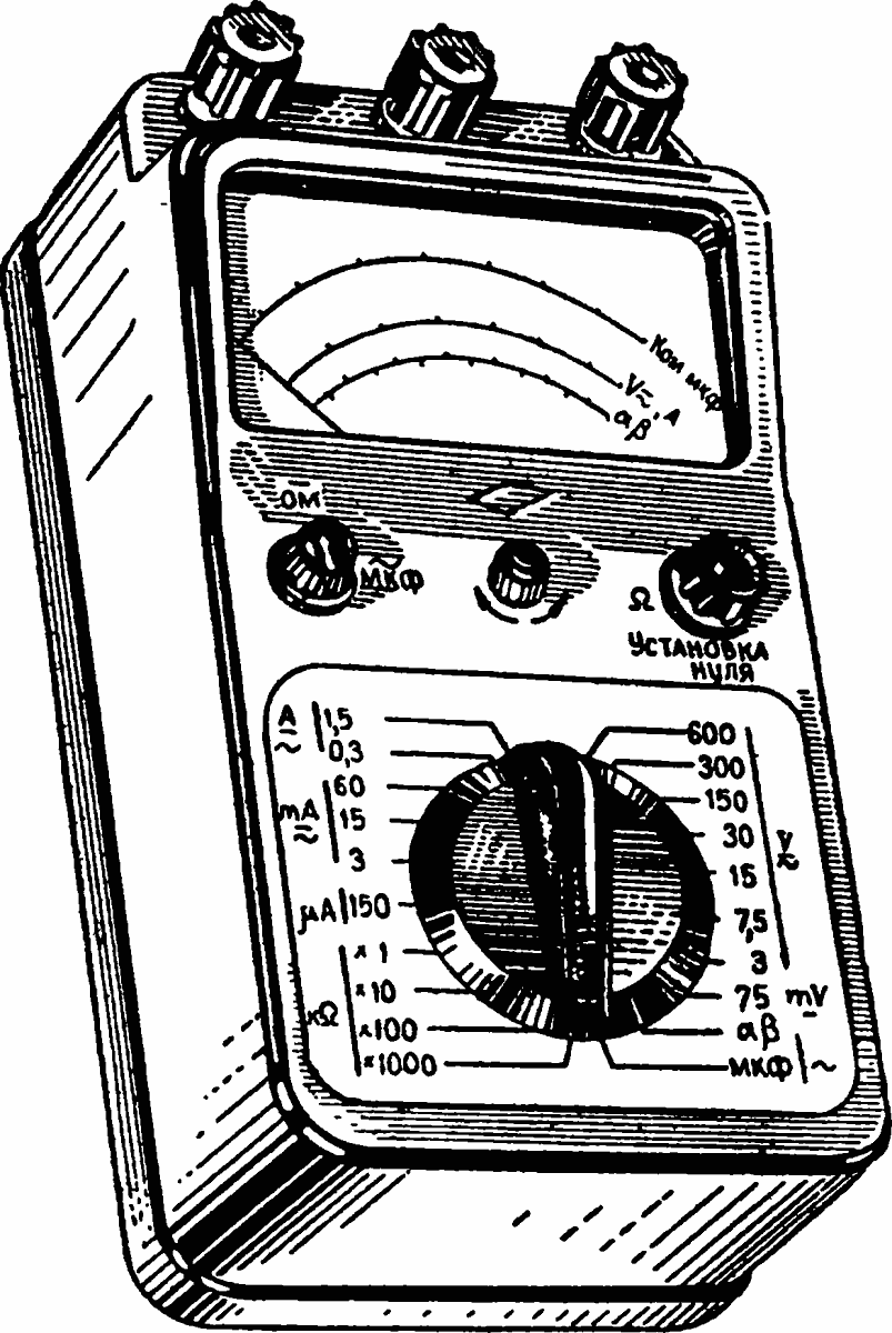 10. Внутреннее сопротивление вольтметра 20 000 ом/в по постоянному току и 2000 ом/в по переменному току. На шкалах 3 и 7,5 в внутреннее сопротивление прибора равно 1000 ом/в.