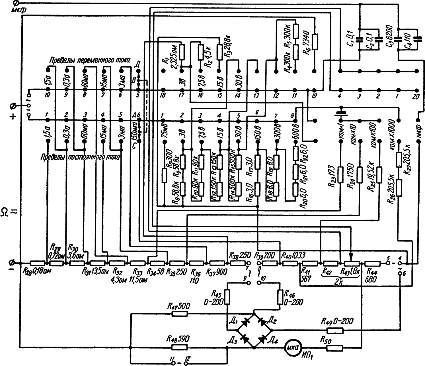 В схеме измерения емкостей образцовые конденсаторы С1—С4 подобраны так, что при подведении к клеммам напряжения 220 в и частотой 50 гц, стрелка прибора отклонится на всю шкалу. Измеряемая емкость шунтирует прибор, уменьшая проходящий через него ток. Индикатором прибора служит микроамперметр на 45 мка.
