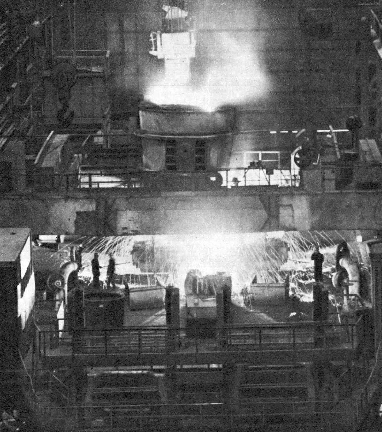 — Не просто ответить на этот вопрос. Специалисты знают, что «повернуть» такую тяжелую и огромную отрасль, как черная- металлургия, на новый путь — это не сменить один станок на другой, пусть даже и дорогой и более совершенный. «Ускорить техническое перевооружение производства» — так записано в Основных направлениях на XXVII съезде КПСС. Что же это значит? Прежде всего нужно заменить мартеновские печи (а в них сегодня в основном выплавляется сталь) конвертерами и электропечами. Работа гигантская и по затратам и по трудоемкости, но необходимая: устарели мартеновские печи, не дают нужной производительности и нужного качества металла. В двенадцатой пятилетке намечено ввести новые кислородно-конвертерные цехи взамен мартеновских на таких больших предприятиях, как Магнитогорский и Кузнецкий металлургические комбинаты, заменить мартеновское производство на электросталеплавильное на заводах «Красный Октябрь» и «Сарканайс металлурге».