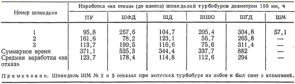 Величины наработки «на отказ» (до износа) каждого испытанного шпинделя показаны в таблице, откуда видно, что наибольшую среднюю наработку 294 ч имеет шпиндель ШГД. Следует отметить, что шпиндели серийных конструкций с резино-металлической и шаровой опорой в этих же условиях имели наработку «на отказ» от 35 до 60 ч.